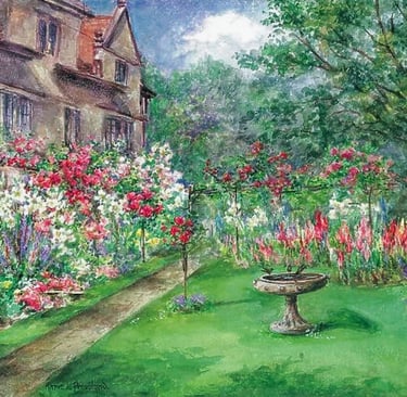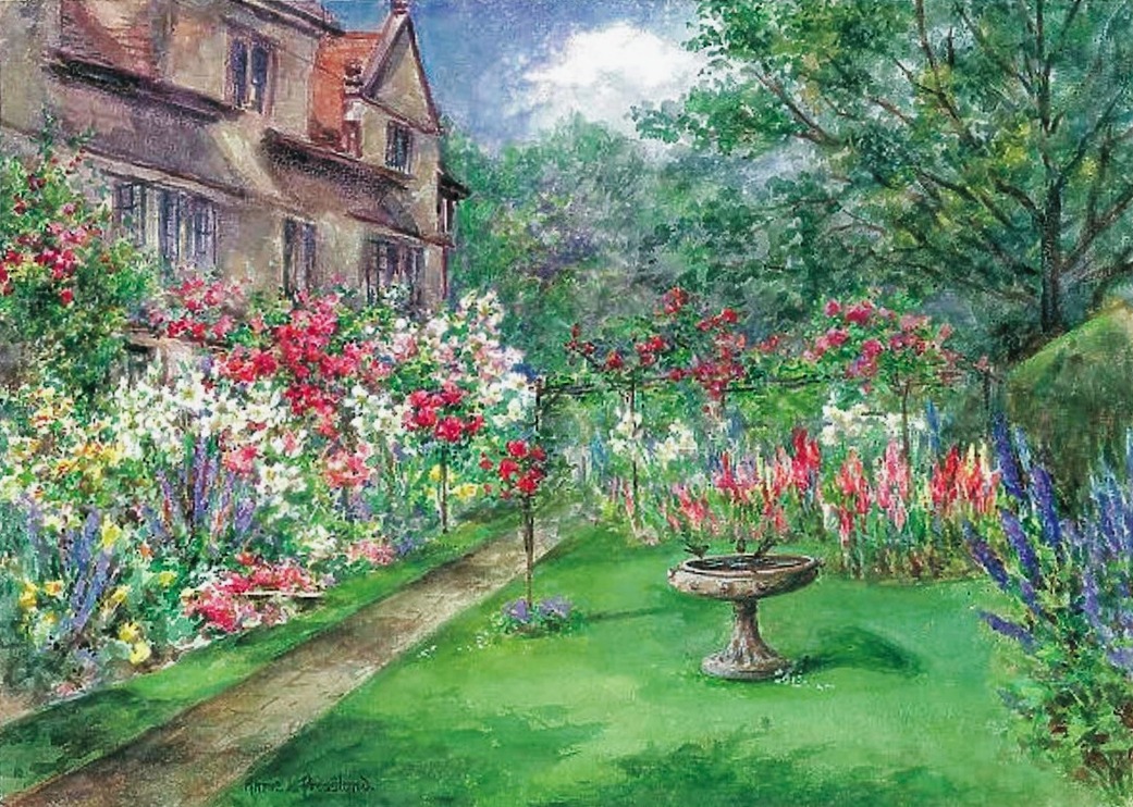 Annie L. Pressland watercolour of a garden path through a lawn with flower borders and bird bath, with a gabled house, 1900-1910.