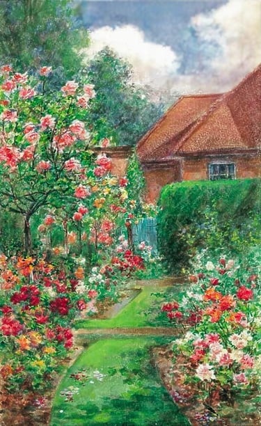 Annie L. Pressland watercolour of ''The Rose Garden'' of Old Mill House in Wannock, East Sussex, 1900-1910.